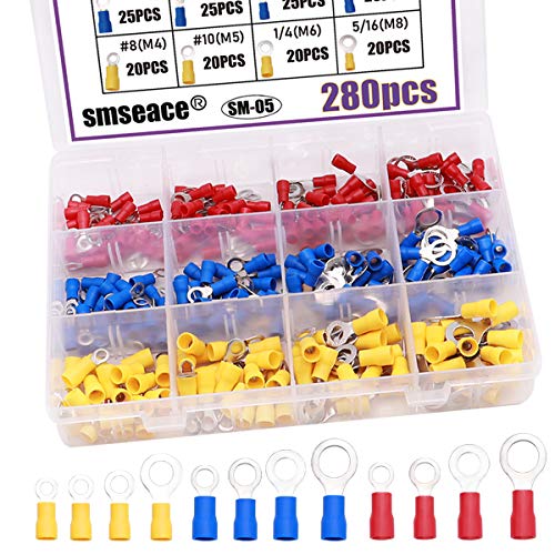 #2 smseace 280pcs Insulated Ring terminals Red Yellow and Blue O-Type Wire Connector Electrical Crimp Terminal AWG 22-16 16-14 12-10 Connectors Assortment Kit SM-05